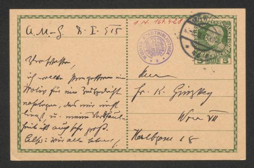 Müller-Guttenbrunn, Adam: Postkarte an Franz Karl Ginzkey. Wien, 8.2.1915