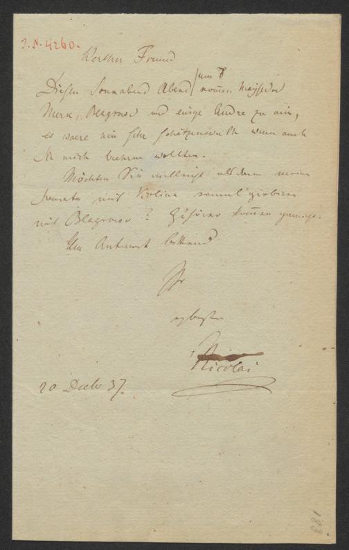 Nicolai, Otto: Billett an Joseph Fischhof. o.O., 20.12.1837