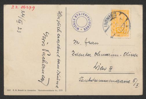 Pachernegg, Alois: Bildpostkarte an Zdenka Ohmann-Oliver. Irdning, 24.12.1923