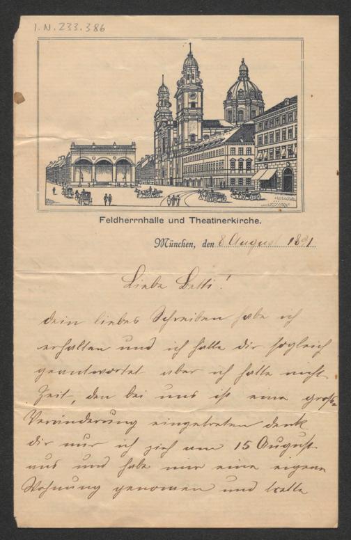 - AnmerkungVgl. Josef Schrammel. Gründer des Schrammelquartetts. Kommentiertes Nachlaßverzeichnis. Bearb. von Martin Peche und Hugo Wetscherek. Wien: Inlibris 2000 (= Inlibris Katalog 7), Nr. 307Briefpapier mit Kopfaufdruck: Feldherrnhalle und Theatinerkirche
