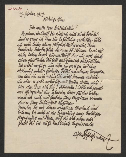 Schliessmann, Hans: Brief an Egon Dietrichstein. Wien, 19.2.1919