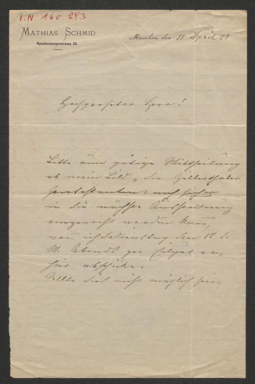 Schmid, Mathias: Brief an Unbekannt. München, 10.4.1877