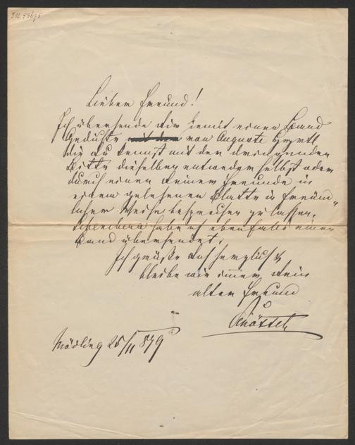 Schöffel, Josef: Brief an Friedrich Schlögl. Mödling, 25.11.1879