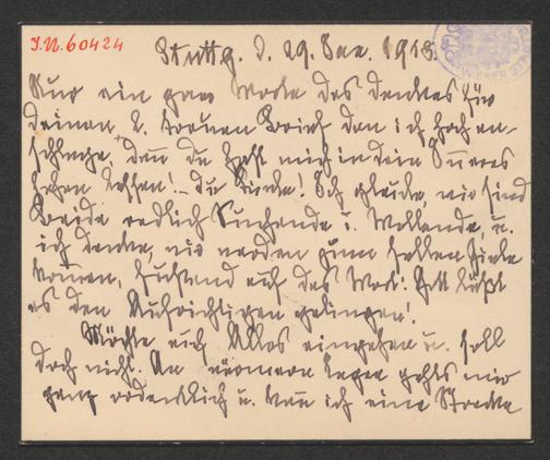 Schumacher, Tony: Billett an Ottilie Franzos. Stuttgart, 29.1.1918