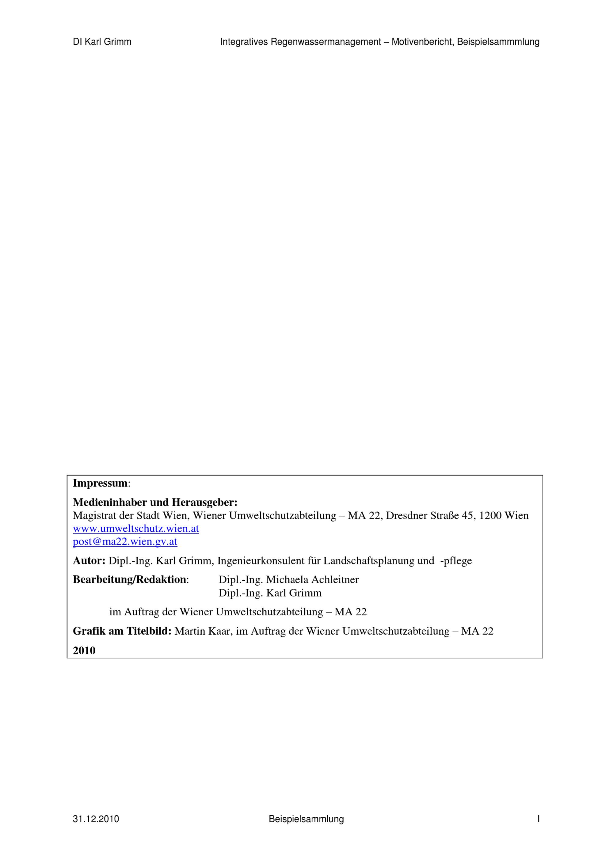 Integratives Regenwassermanagement / Autor: Dipl.-Ing. Karl Grimm, Ingenieurkonsulent für Landschaftsplanung und -pflege ; im Auftrag der Wiener Umweltschutzabteilung - MA 22 / Beispielsammlung