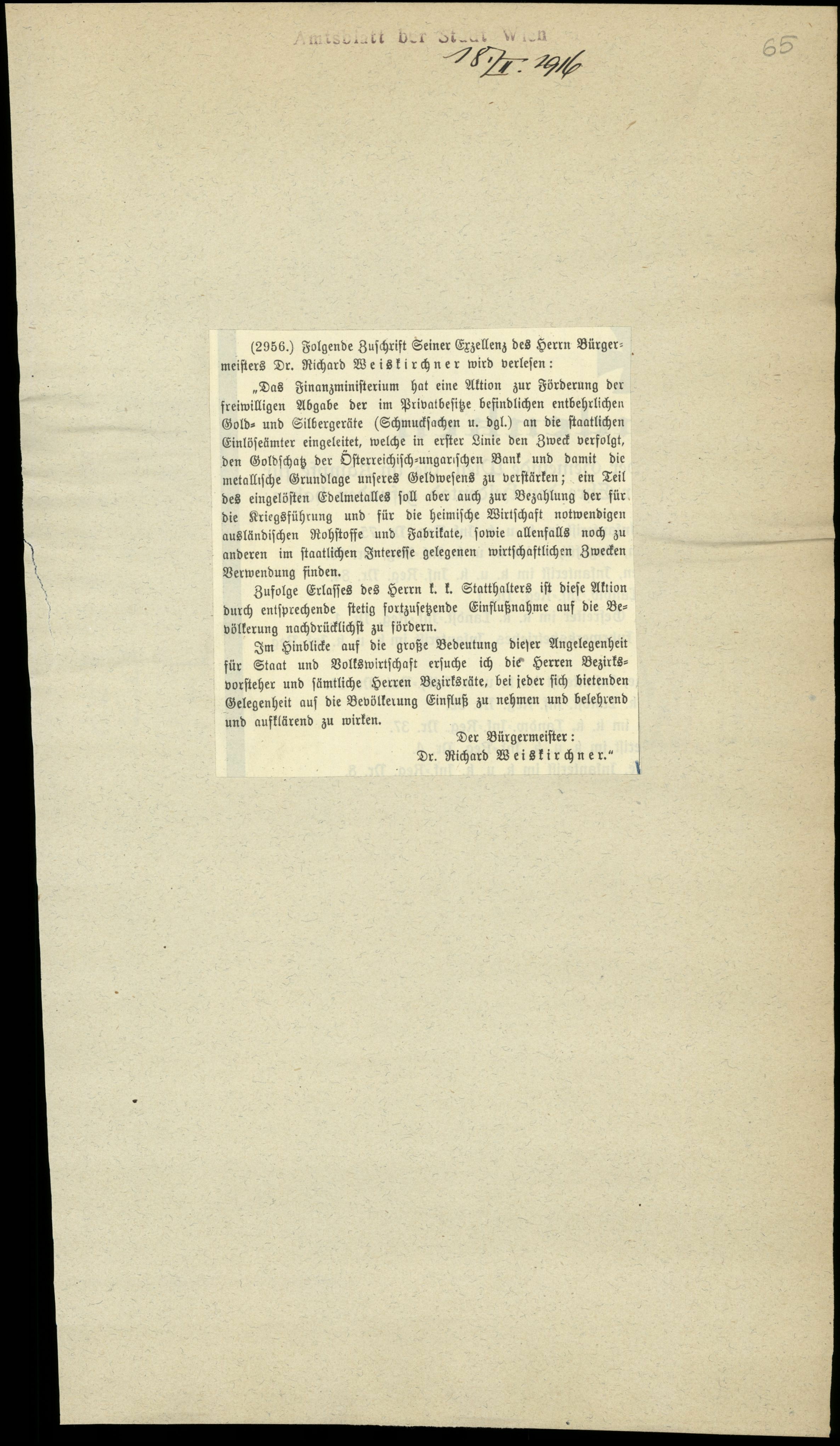 (2956.) Folgende Zuschrift Seiner Exzellenz des Herrn Bürgermeisters Dr. Richard Weiskirchner wird verlesen :