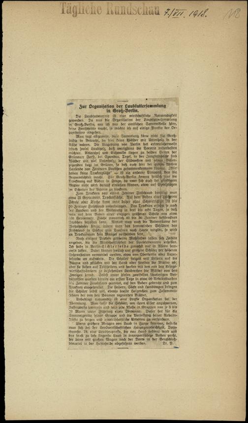 / Zur Organisation der Laubfuttersammlung in Groß-Berlin. 7.7.1918