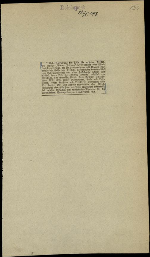 / Außerkraftsetzung der Zölle für mehrere Artikel. 28.2.1918