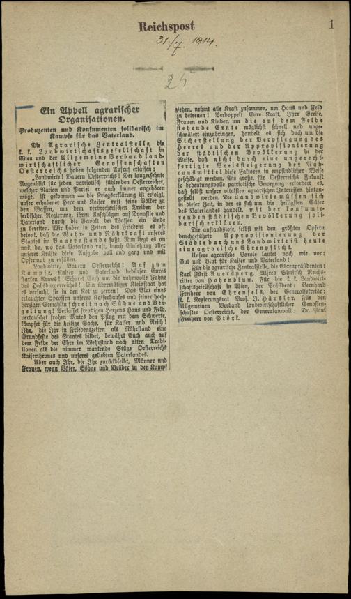 Weltkrieg : Zeitungsausschnittsammlung vom Weltkrieg 1914 - 1918 : Approvisionierung ; B, Landwirtschaftliche Maßnahmen ; [...]