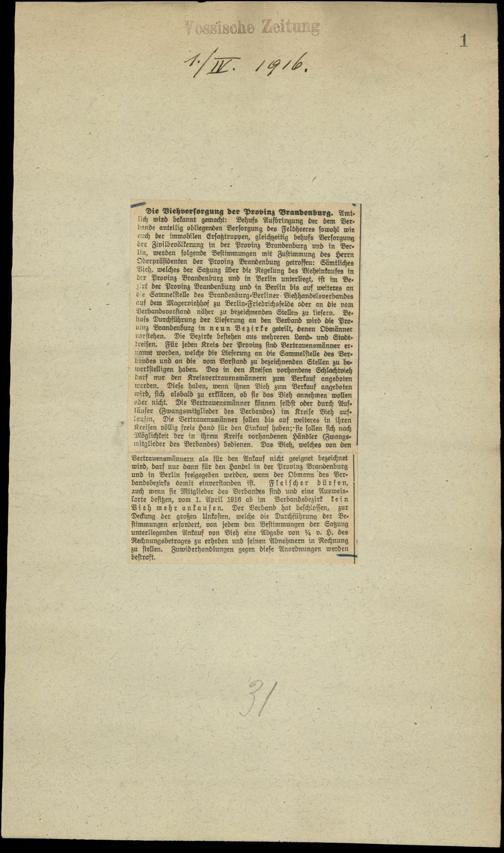 Weltkrieg : Zeitungsausschnittsammlung vom Weltkrieg 1914 - 1918 : Approvisionierung ; E, Fleisch ; Bd. 13 = 1916: 1.4. - [...]
