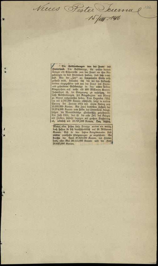 / Die Geldsendungen von der Front ins Hinterland. 15.8.1916