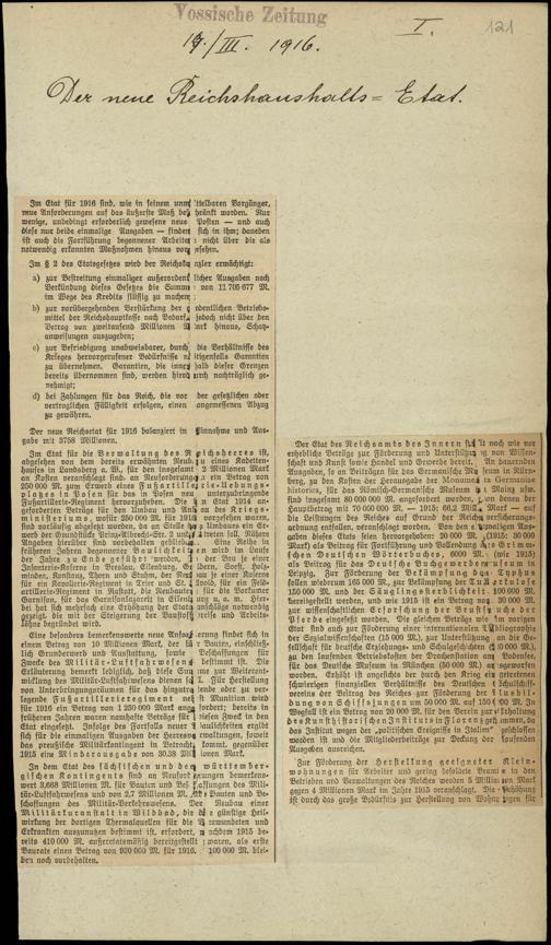 / Der neue Reichshaushalts-Etat. 14.3.1916