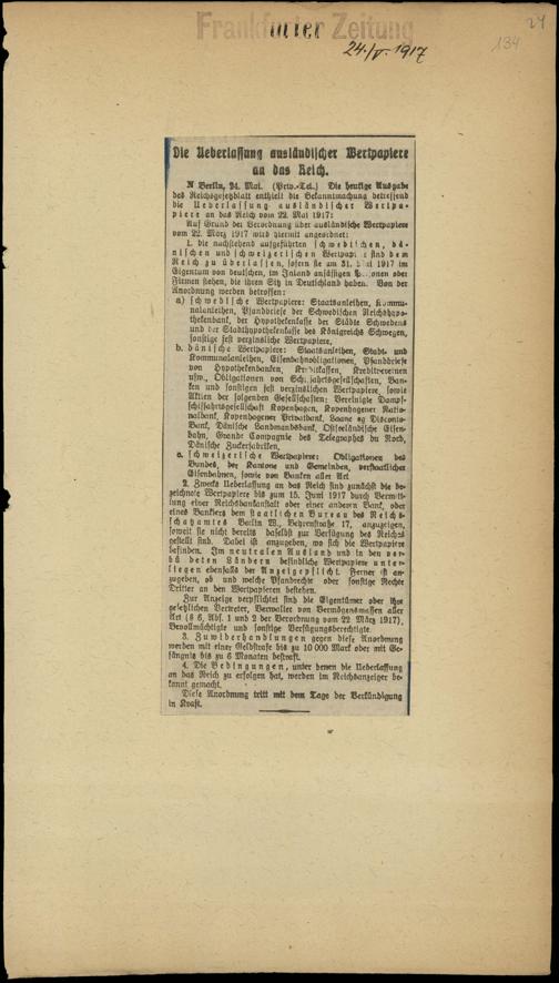 / Die Ueberlassung ausländischer Wertpapiere an das Reich. 24.5.1917