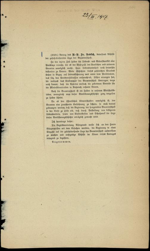 / Antrag des B.-R. Dr. Redlich betreffend Abhilfe der gefahrdrohenden Lage der Beamtenschaft. 23.11.1917
