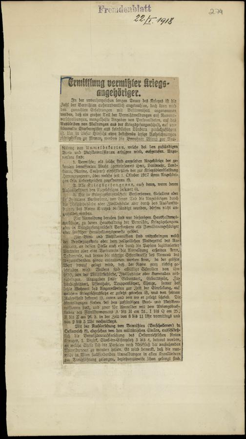 / Ermittlung vermißter Kriegsangehöriger. 22.1.1918