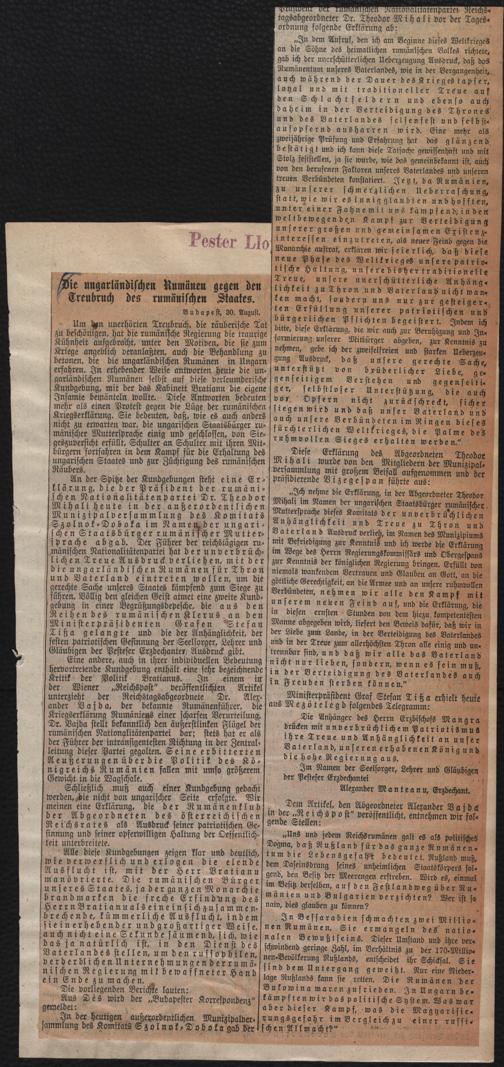 / Die ungarländischen Rumänen gegen den Treubruch des rumänischen Staates. 31.8.1916