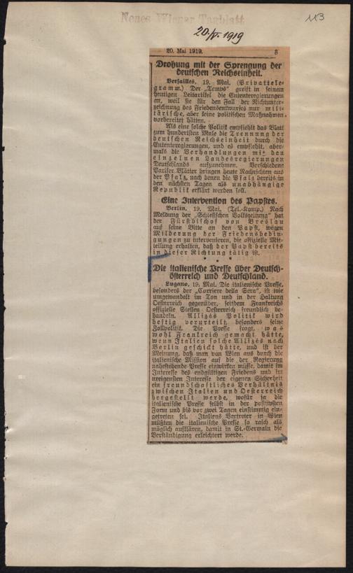 / Die italienische Presse über Deutsch-österreich und Deutschland. 20.5.1919