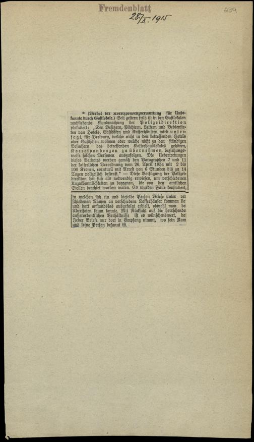 / Verbot der Korrespondenzvermittlung für Unbe-kannte durch Gastlokale. 28.10.1915
