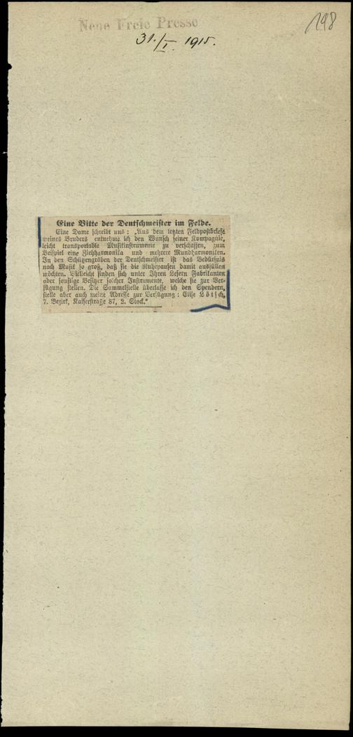 / Eine Bitte der Deutschmeister im Felde. 31.1.1915