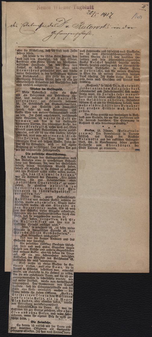 / Die Erlebnisse des Dr. v. Rutowski in der Gefangenschaft. 20.1.1917
