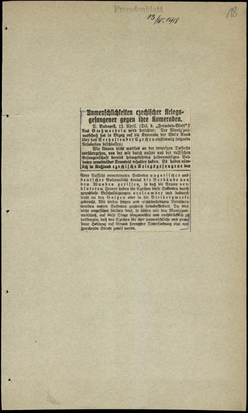/ Unmenschlichkeiten czechischer Kriegsgefangener gegen ihre Kameraden. 13.4.1918