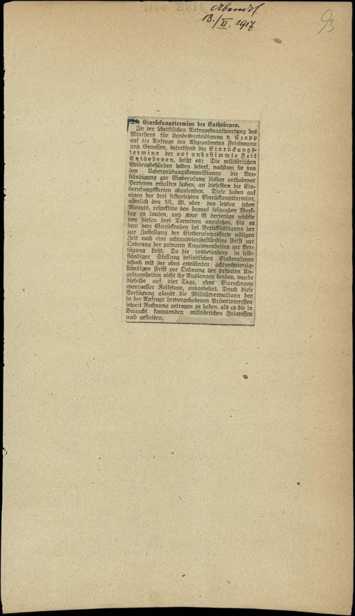 / Die Einrückungstermine der Enthobenen. 13.11.1917