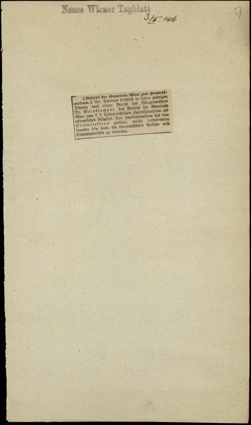 / Beitritt der Gemeinde Wien zum Handelsmuseum. 3.3.1916