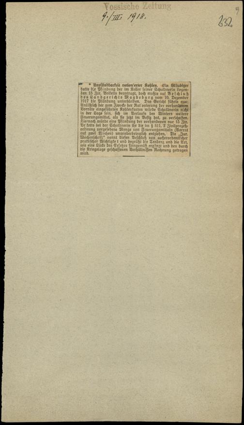 / Unpfändbarkeit rationierter Kohlen. 9.3.1918